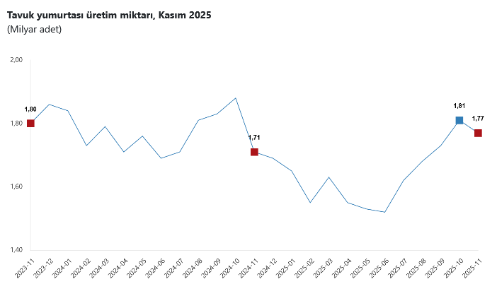Aylık bazda, 1 milyar 808 milyon 918 bin adet olan tavuk yumurtası üretimi Kasım ayında yüzde 2,0 azalarak 1 milyar 771 milyon 906 bin adete indi.