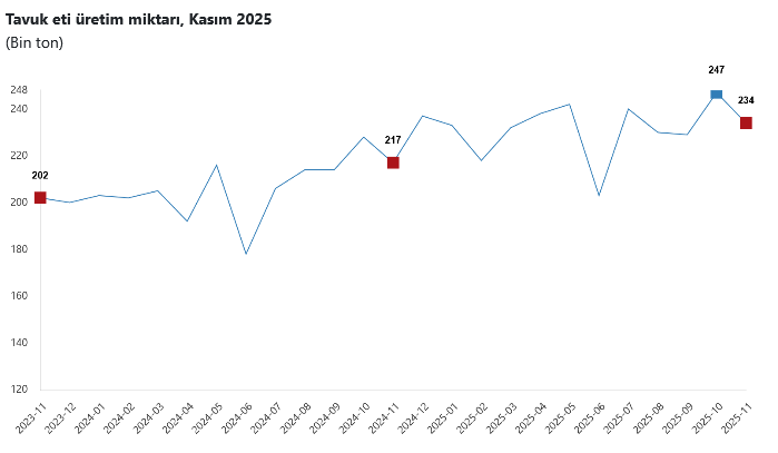 Aylık bazda, 247 bin 392 ton olan tavuk eti üretimi Kasım'da yüzde 5,5 azalarak 233 bin 887 tona düştü.